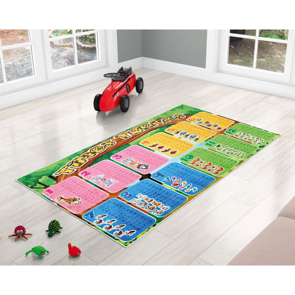 Kusový dětský koberec s 3D fototiskovým s hracím vzorem násobilky v zelených, modrých a růžových barvách v rozměru 80x150cm. Běhoun je vhodný do dětských pokojů a díky vzoru si můžou děti procvičovat násobilku. Speciální 3D fototiskové provedení koberce zaujme svým realistickým vzhledem, věrnými barvami i nezvykle příjemným pocitem na dotek. Jsou vyrobeny ze 100% polypropylenu. Latexový nátěr na spodní straně běhounu vytváří protiskluzový povrch, takže Vám nehrozí uklouznutí na mokré podlaze.