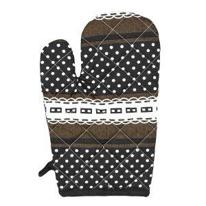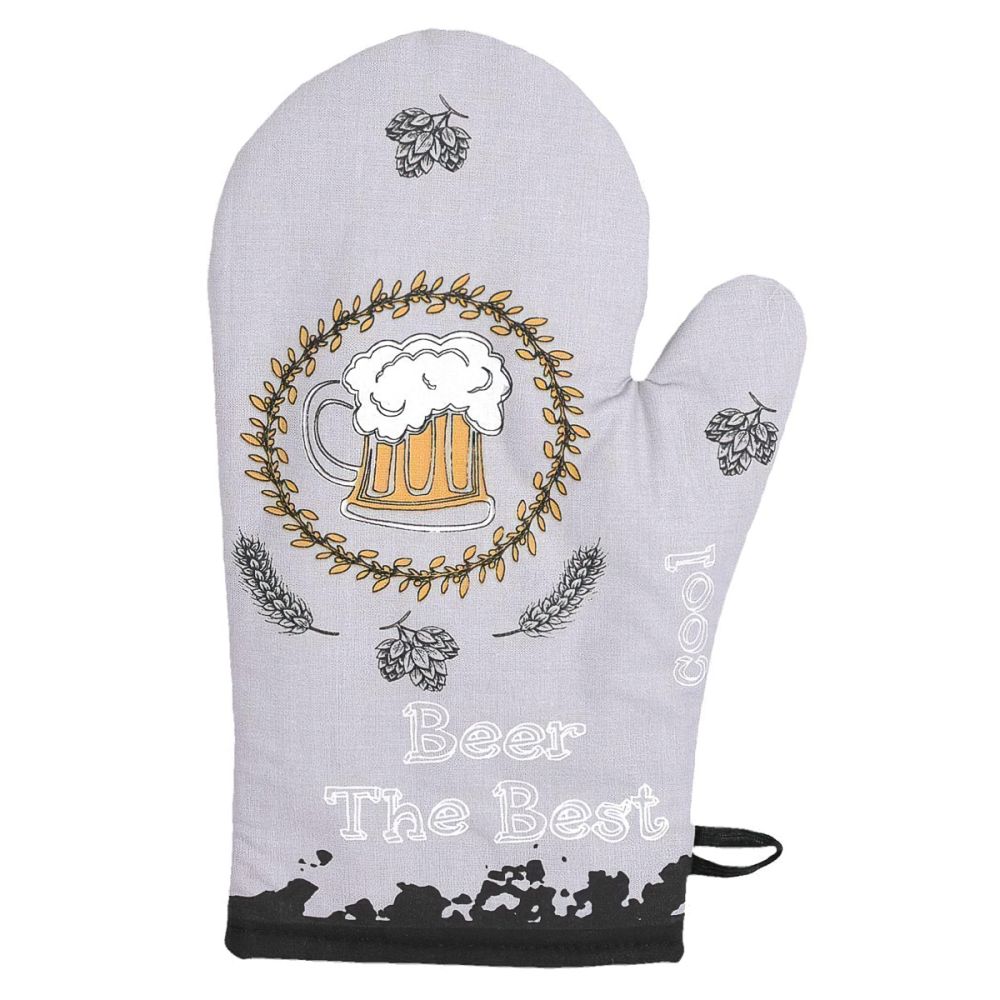 Kuchyňská chňapka (rukavice) se vzorem sklenice s pivem v šedém provedení. Chňapka má všitý magnet a poutko na zavěšení. Chňapka je v rozměru 28x18cm a je vyrobena ze 100% bavlny s výplní ze 100% polyesteru (rouno z dutého vlákna).