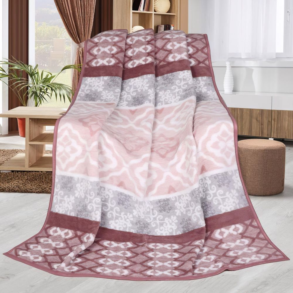 Hebká a jemná deka s hustým vlasem připomínající styl deky Larisa. Deka je z kolekce Karmela PLUS, má oboustranný vzor ornamentů na růžovo-šedém pozadí. Přikrývka je vyvedena s vysokou gramáží 450g/m2 a je dostupná v rozměru 150x200cm na jednolůžko.