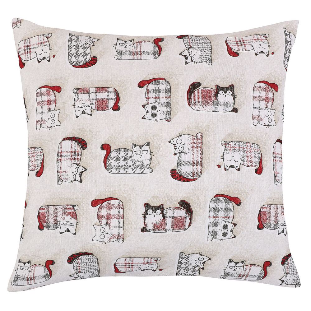 Dekorační polštářek s motivem kreslených červených kočiček na režném podkladu. Polštářek je z obou stran stejný. Povlak na polštářek je vyroben ze 70% bavlny a 30% polyesteru a výplň je tvořena ze 100% Polyesteru (kuličky z dutého vlákna). Vnitřní výplň je možné vyjmout a prát povlak samostatně.