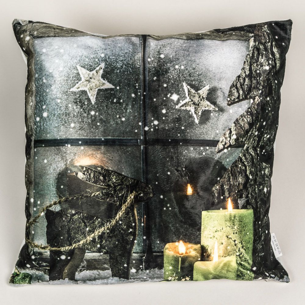 Dekorační svítící polštářek se vzorem zasněženého okna a svíček, které svítí díky led diodám, které jsou vloženy uvnitř polštářku a dodávají tak vánoční atmosféru. Polštářek má rozměr 45 x 45 cm. Povlak na polštářek je vyroben ze 100% polyesteru a je velmi hebký a příjemný na omak. Vnitřní výplň je možné vyjmout a prát povlak samostatně. Napájení je na 2 ks AA baterie 1,5V a nejsou součástí výrobku.