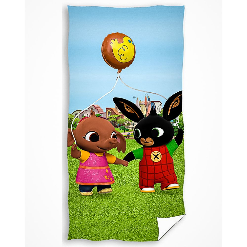 Dětská plážová osuška ZAJÍČEK BING A SULA S POUŤOVÝM BALÓNKEM, zeleno-modrá, froté, 70x140cm