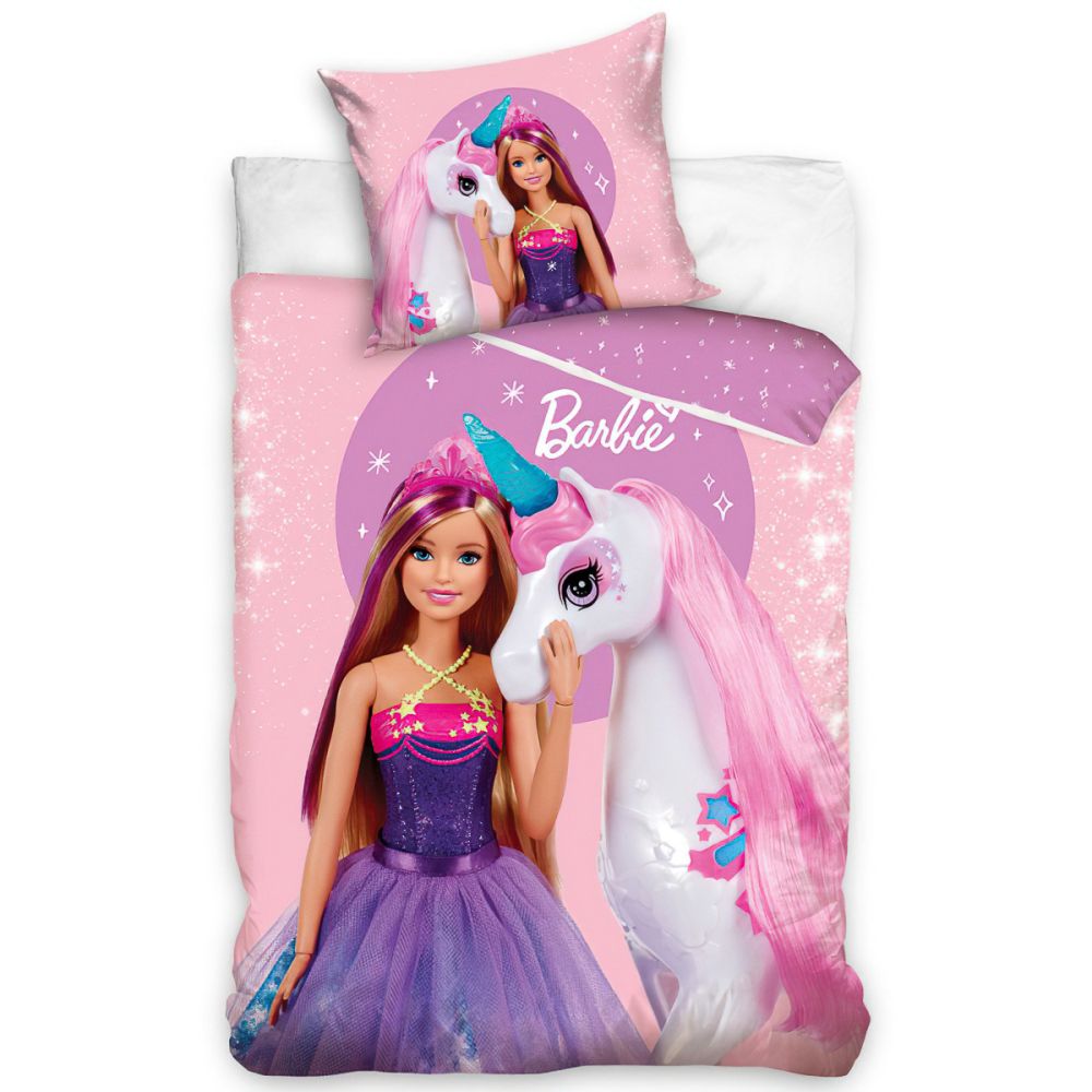 Dětské bavlněné povlečení s motivem pro holky se vzorem panenky Barbie a bílým jednorožcem na světle růžovém podkladu. Povlečení je oboustranné. Z druhé strany jsou hvězdičky na světle fialovém pozadí. Souprava je vyrobena ze 100% bavlny a obsahuje jeden povlak na přikrývku 140 x 200 cm a jeden povlak na polštář 70 x 90 cm. Zapínání na zip.