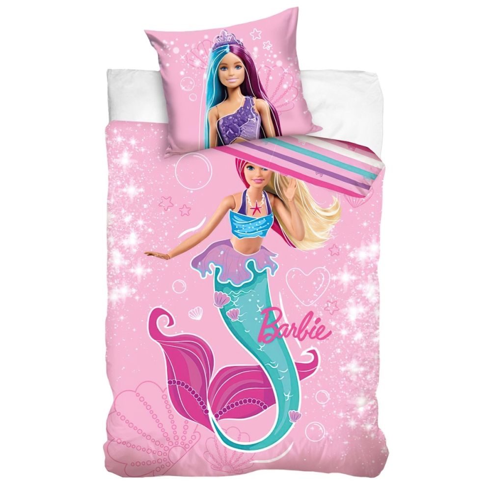 Dětské bavlněné povlečení s motivem pro holky se vzorem panenky Barbie v podobě mořské panny. Povlečení je oboustranné. Z druhé strany jsou barevné proužky na růžovém pozadí. Souprava je vyrobena ze 100% bavlny a obsahuje jeden povlak na přikrývku 140 x 200 cm a jeden povlak na polštář 70 x 90 cm. Zapínání na zip.