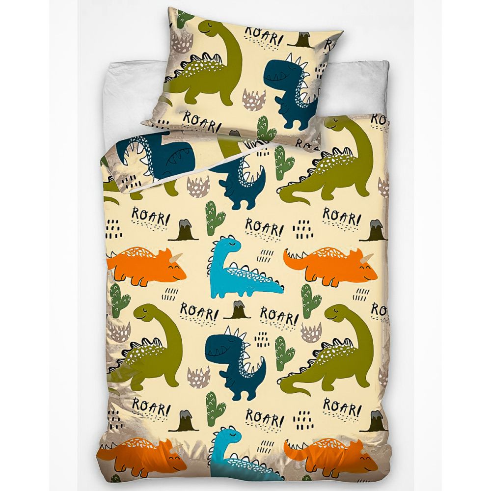 Dětské bavlněné povlečení do postýlky se vzorem barevných dinosaurů na žluto-béžovém podkladu. Povlečení je oboustranné a z obou stran stejné. Souprava je vyrobena ze 100% bavlny a obsahuje jeden povlak na přikrývku 100 x 135 cm a jeden povlak na polštář 40 x 60 cm. Zapínání na zip.