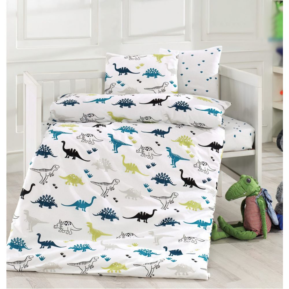 Dětské bavlněné povlečení do postýlky pro kluky s motivem barevných dinosaurů na bílém podkladu. Povlečení je oboustranné a z obou stran stejné. Souprava je vyrobena ze 100% bavlny a obsahuje jeden povlak na přikrývku 100 x 135 cm a jeden povlak na polštář 40 x 60 cm. Zapínání na zip.