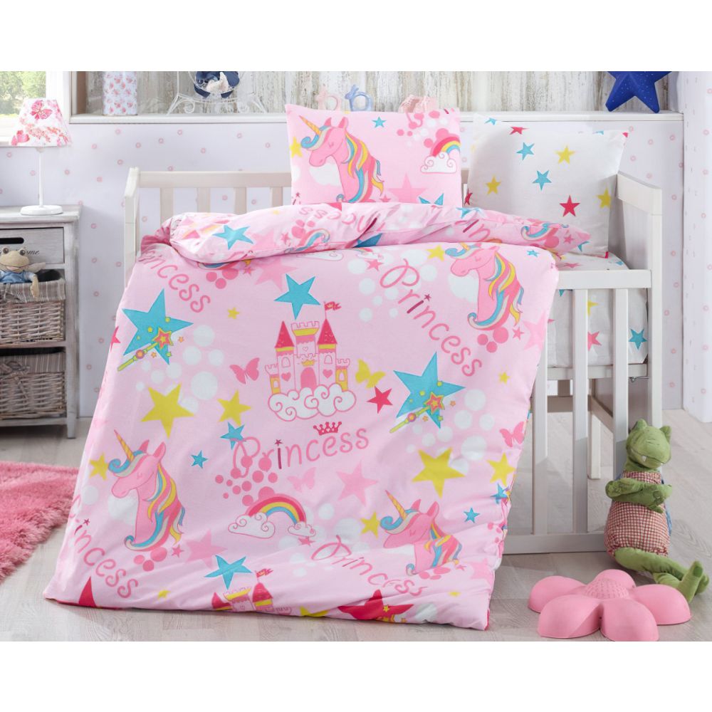Dětské bavlněné povlečení do postýlky pro holky s motivem jednorožců, zámku a hvězdiček na růžovém podkladu. Povlečení je oboustranné a z obou stran stejné. Souprava je vyrobena ze 100% bavlny a obsahuje jeden povlak na přikrývku 100 x 135 cm a jeden povlak na polštář 40 x 60 cm. Zapínání na zip.