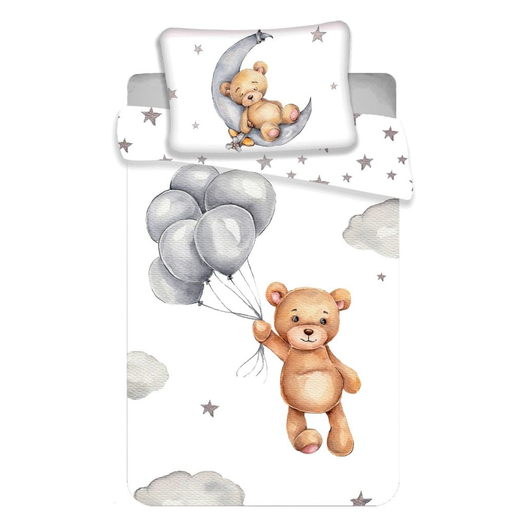 Dětské bavlněné povlečení do postýlky se vzorem medvídka s balonky na bílém pozadí. Povlečení je oboustranné, z jedné strany je velký vzor medvídka, z druhé strany je vzor hvězdiček na bílém pozadí. Souprava je vyrobena ze 100% bavlny a obsahuje jeden povlak na přikrývku 100 x 135 cm a jeden povlak na polštář 40 x 60 cm. Zapínání na zip.