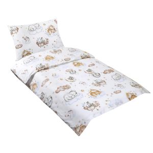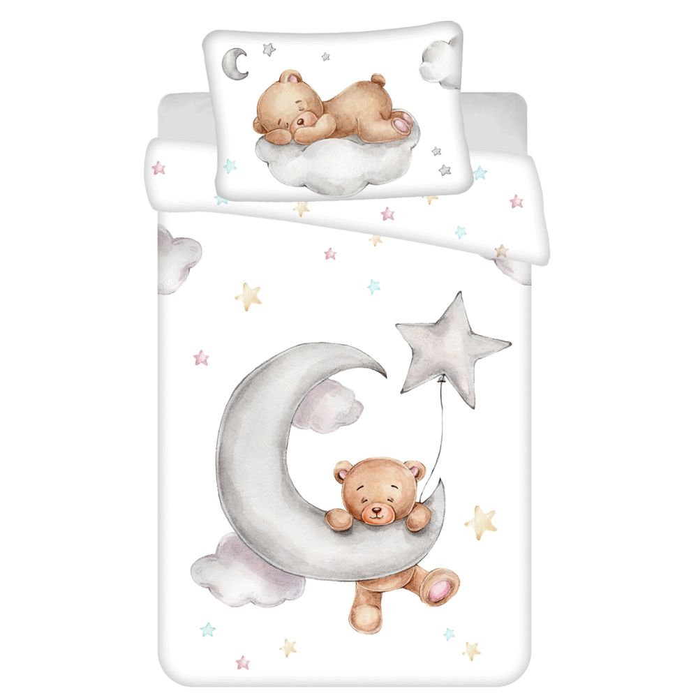 Dětské bavlněné povlečení do postýlky se vzorem roztomilého medvídka na mráčku a měsíčku na bílém podkladu s hvězdičkami. Povlečení je oboustranné, z druhé strany je vzor hvězdiček. Souprava obsahuje povlak na přikrývku 100 x 135 cm a jeden povlak na polštář 40 x 60 cm. Zapínání na zip.