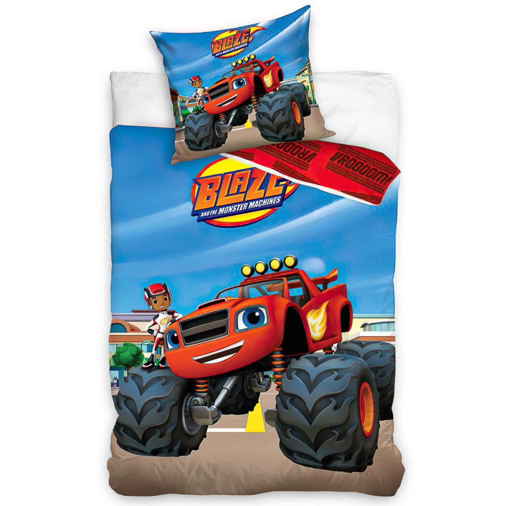Dětské povlečení do postýlky PLAMÍNEK A ČTYŘKOLÁCI MONSTER TRUCK, modré, bavlna hladká, 100x135cm + 40x60cm