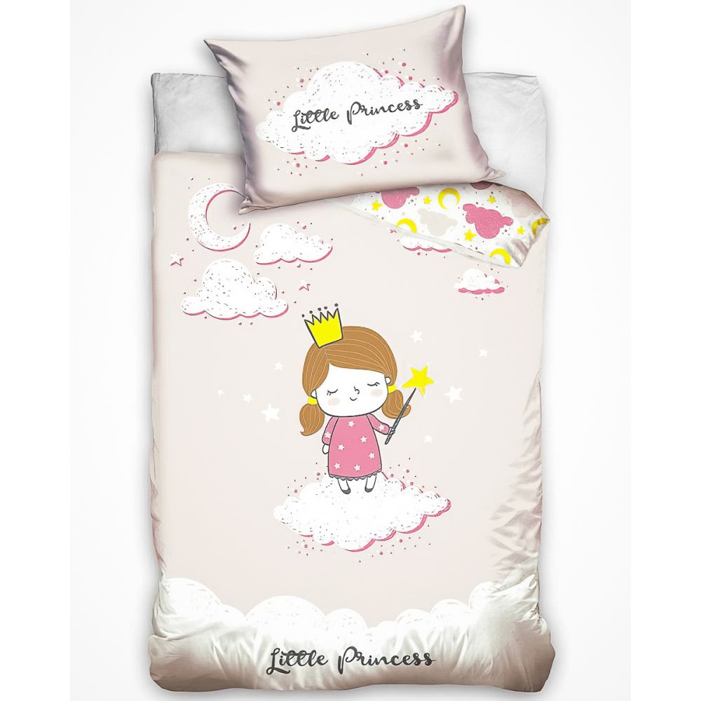 Dětské bavlněné povlečení do postýlky se vzorem roztomilé malé princezny na bílém obláčku na světle růžovém podkladu. Povlečení je oboustranné, z druhé strany je vzor růžových obláčků a žlutých hvězdiček a měsíčků na bílé. Souprava je vyrobena ze 100% bavlny a obsahuje jeden povlak na přikrývku 100 x 135 cm a jeden povlak na polštář 40 x 60 cm. Zapínání na zip.