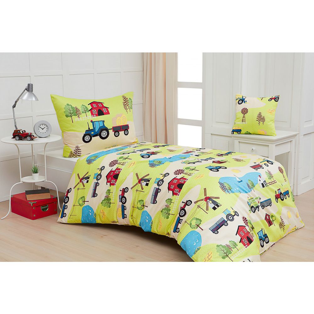 Dětské povlečení Matějovský EKOFARMA, traktory na farmě na světle zelené, bavlna hladká, 140x200cm + 70x90cm