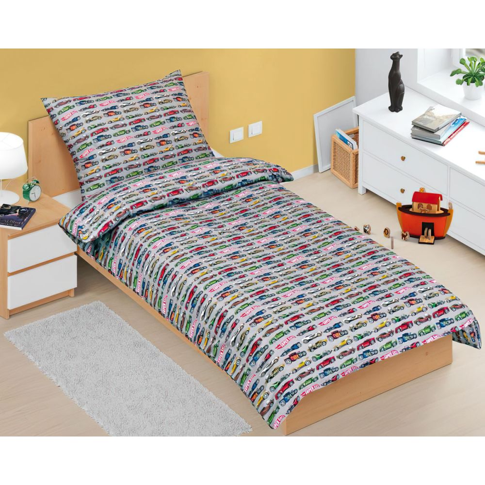 Dětské bavlněné povlečení s motivem formulí na šedém podkladu. Povlečení je z obou stran stejné. Souprava je vyrobena ze 100% bavlny a obsahuje jeden povlak na přikrývku 140 x 200 cm a jeden povlak na polštář 70 x 90 cm. Zapínání na zip.