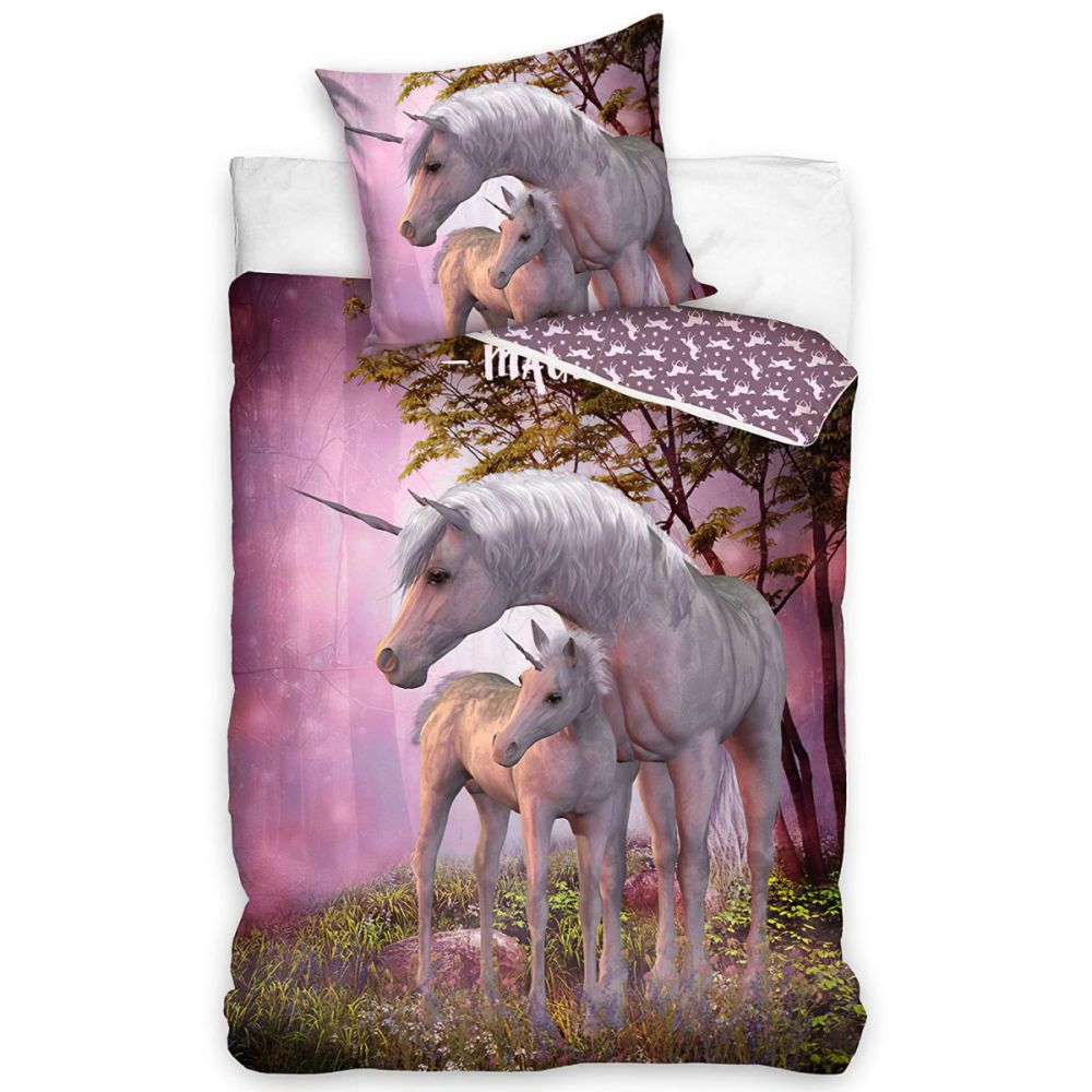 Bavlněné povlečení s motivem dvou bájných jednorožců na růžovém podkladu. Povlečení je oboustranné, z druhé strany má vzor bílých jednorožců na růžové. Souprava je vyrobena ze 100% bavlny renforcé a obsahuje jeden povlak na přikrývku 140 x 200 cm a jeden povlak na polštář 70 x 90 cm. Zapínání na zip.