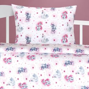Dětské bavlněné povlečení s motivem růžové labutě a jednorožce na šedém podkladu. Povlečení je z obou stran stejné. Souprava je vyrobena ze 100% bavlny a obsahuje jeden povlak na přikrývku 140 x 200 cm a jeden povlak na polštář 70 x 90 cm. Zapínání na zip.