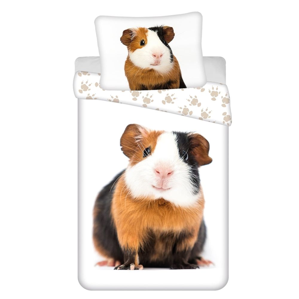 Dětské bavlněné povlečení se vzorem morčete na bílém pozadí. Povlečení je oboustranné, z druhé strany jsou tlapky na bílém podkladu. Souprava je vyrobena ze 100% bavlny a obsahuje jeden povlak na přikrývku 140 x 200 cm a jeden povlak na polštář 70 x 90 cm. Zapínání na zip.
