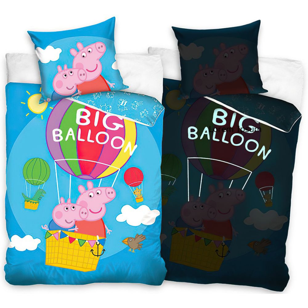 Dětské bavlněné povlečení s motivem prasátka Pepiny s bráškou Tomem v balónu na modrém pozadí. Z druhé strany jsou malé postavičky Pepiny na modré. Speciální svítivá vrstva způsobí, že některé části povlečení v noci hezky fosforekují. Souprava je vyrobena ze 100% bavlny a obsahuje jeden povlak na přikrývku 140 x 200 cm a jeden povlak na polštář 70 x 90 cm. Zapínání na ZIP.
