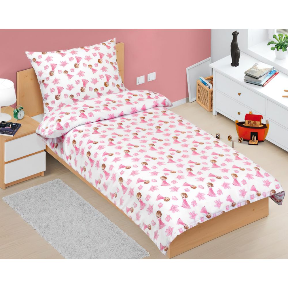 Dětské bavlněné povlečení s motivem malých princezen v růžové barvě na bílém podkladu. Povlečení je z obou stran stejné. Souprava je vyrobena ze 100% bavlny a obsahuje jeden povlak na přikrývku 140 x 200 cm a jeden povlak na polštář 70 x 90 cm. Zapínání na zip.