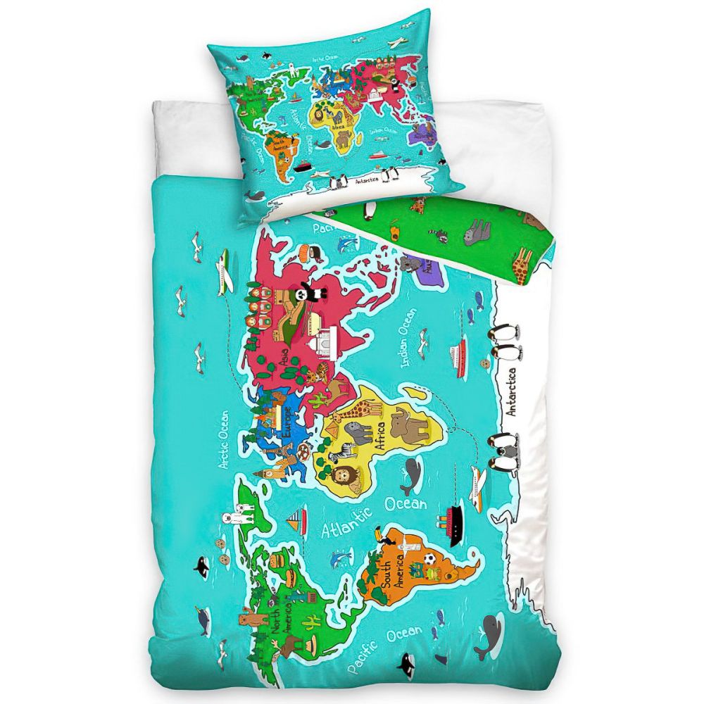 Dětské bavlněné povlečení s motivem mapy světa a jednotlivých světadílů, ve kterých jsou vyznačeny typická zvířata a stavby na světle tyrkysovém podkladu. Z druhé strany je povlečení jednobarevné v zelené barvě se zvířátky. Souprava je vyrobena ze 100% bavlny a obsahuje jeden povlak na přikrývku 140 x 200 cm a jeden povlak na polštář 70 x 90 cm. Zapínání na ZIP.
