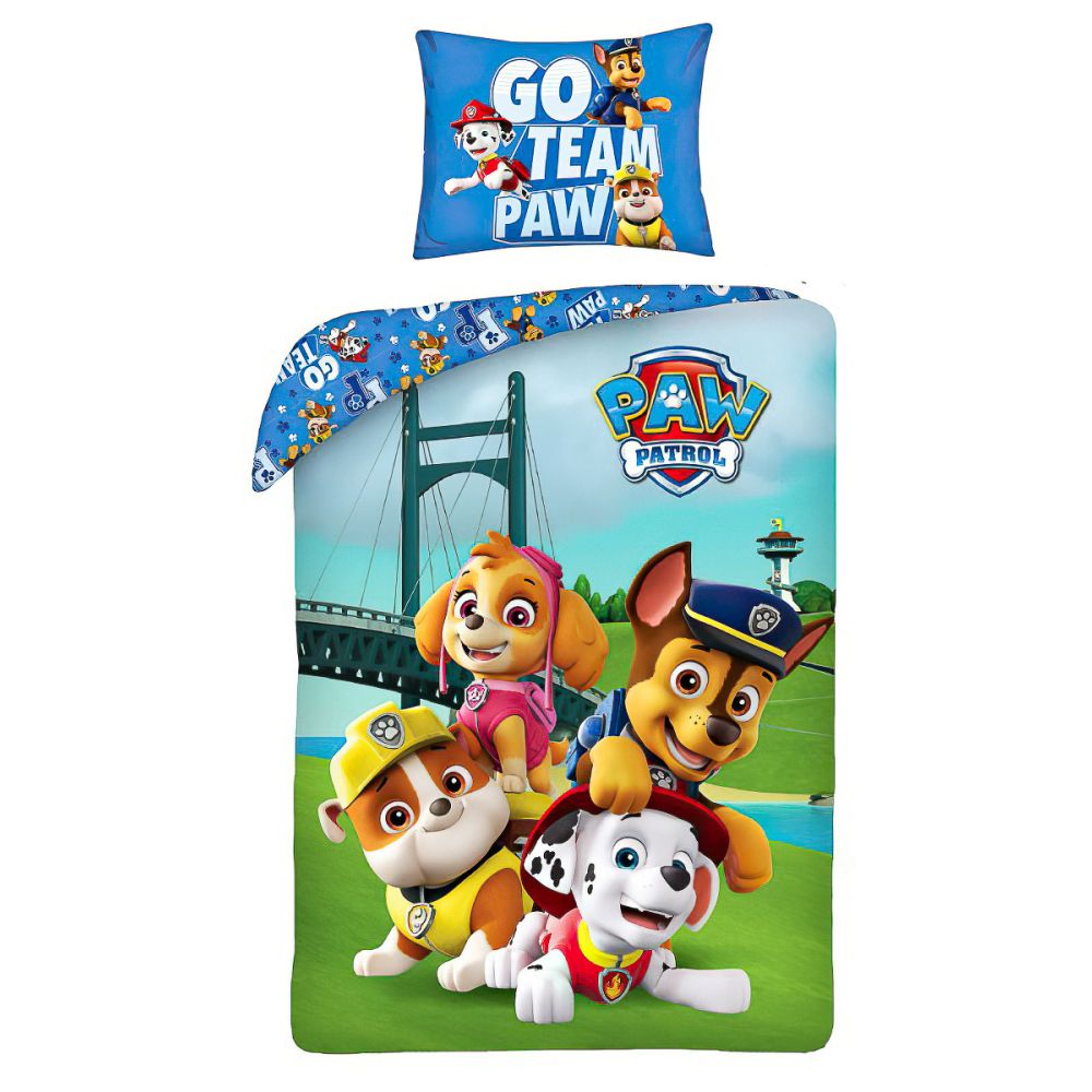 Dětské bavlněné povlečení s motivem hlavních hrdinů ze seriálu Tlapková patrola na zeleno-modrém podkladu. Rubová strana má vzor malých obrázků štěněcích záchranářů a tlapek s nápis Go Team Paw na modrém podkladu. Souprava je vyrobena ze 100% bavlny a obsahuje jeden povlak na přikrývku 140 x 200 cm a jeden povlak na polštář 70 x 90 cm. Zapínání na zip.
