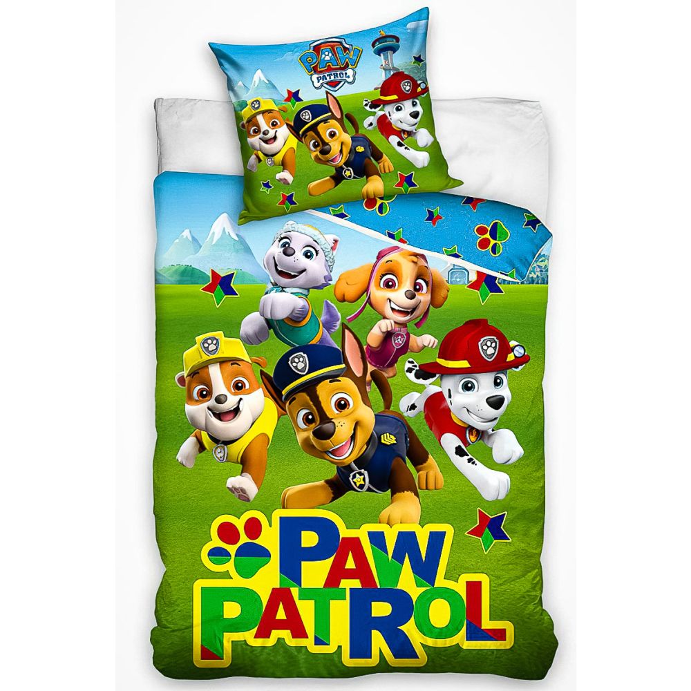 Dětské bavlněné povlečení s motivem hlavních hrdinů ze seriálu Tlapková patrola na zeleném podkladu. Rubová strana má vzor hvězdiček a tlapek na modrém podkladu. Souprava je vyrobena ze 100% bavlny a obsahuje jeden povlak na přikrývku 140 x 200 cm a jeden povlak na polštář 70 x 90 cm. Zapínání na zip.