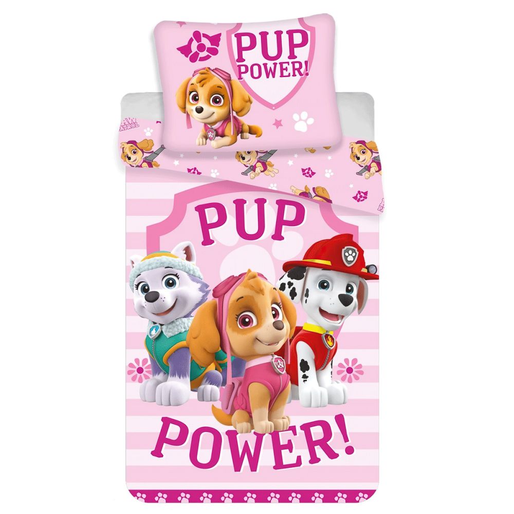 Dětské bavlněné povlečení s motivem hrdinů ze seriálu Tlapková patrola Skay, Everest a Marshallem na růžovém podkladu. Rubová strana má vzor Skay na růžovém podkladu. Souprava je vyrobena ze 100% bavlny a obsahuje jeden povlak na přikrývku 140 x 200 cm a jeden povlak na polštář 70 x 90 cm. Zapínání na zip.