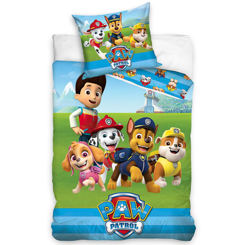Dětské bavlněné povlečení s motivem hlavních hrdinů ze seriálu Tlapková patrola na zeleném podkladu. Rubová strana má vzor malých hrdinů Tlapkové patroly na modrém proužku. Souprava je vyrobena ze 100% bavlny a obsahuje jeden povlak na přikrývku 140 x 200 cm a jeden povlak na polštář 70 x 90 cm. Zapínání na zip.