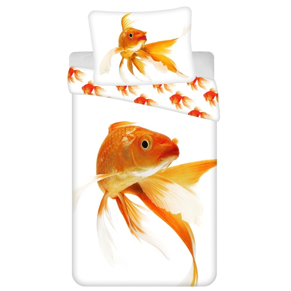 Bavlněné povlečení s fototiskovým vzorem zlaté rybky na bílém podkladu. Povlečení je oboustranné, z druhé strany jsou malé rybky na bílé. Souprava je vyrobena ze 100% bavlny a obsahuje jeden povlak na přikrývku 140 x 200 cm a jeden povlak na polštář 70 x 90 cm. Zapínání na zip.