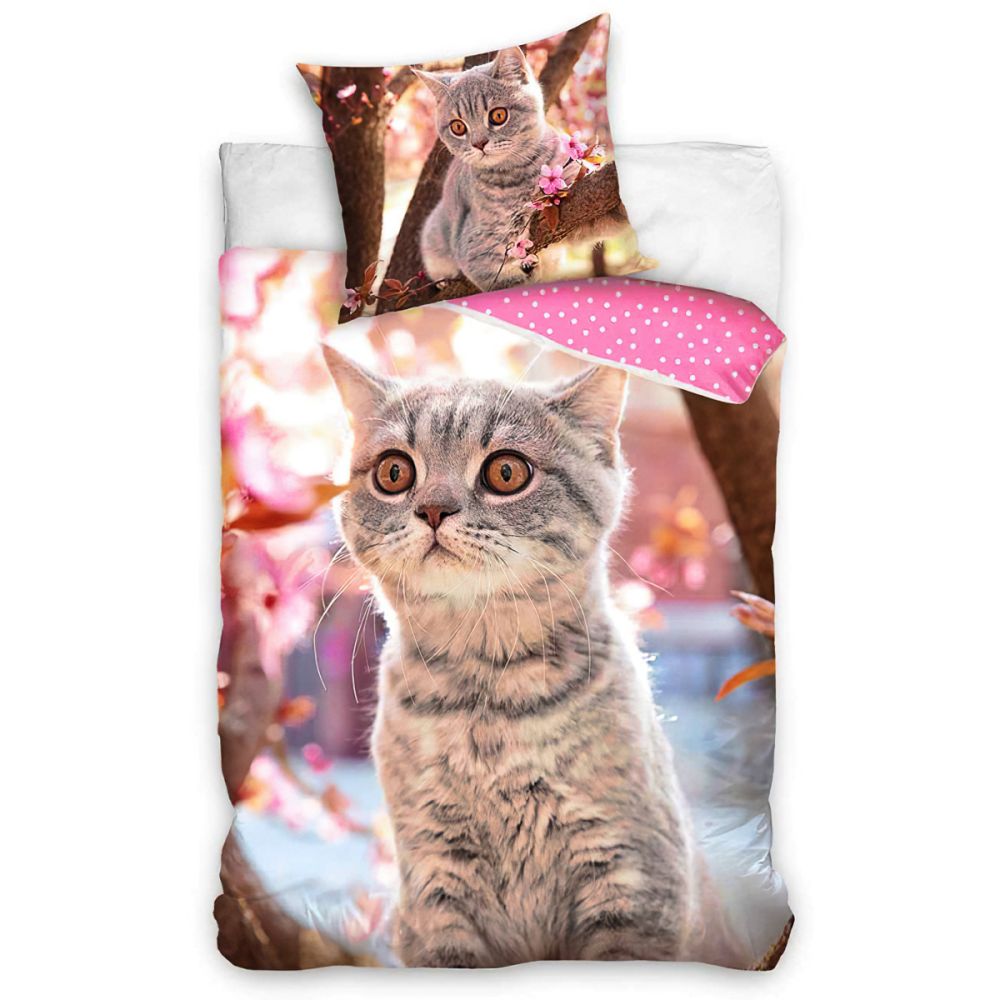 Bavlněné povlečení s motivem malého koťátka. Povlečení je oboustranné, z druhé strany má vzor bílých puntíků na růžové. Souprava je vyrobena ze 100% bavlny renforcé a obsahuje jeden povlak na přikrývku 140 x 200 cm a jeden povlak na polštář 70 x 90 cm. Zapínání na zip.