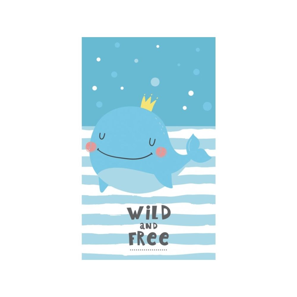 Dětský froté ručník se vzorem velryby s korunkou na modrém pozadí s proužky. Ručníček je vyroben v rozměru 30 x 50 cm z vysoce kvalitní 100% bavlny v gramáži 350 g/m2, díky čemuž je měkký a příjemný k pokožce. Vzor je tištěn digitální metodou, která zajišťuje ostrý vzor a syté barvy.