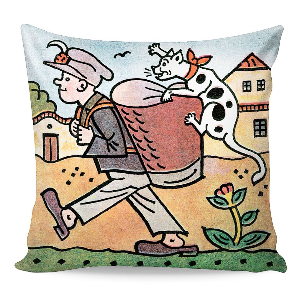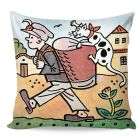 Dětský polštářek s vesnickým motivem v typické kresbě Josefa Lady v béžových a světle modrých odstínech. Povlak má z obou stran stejný vzor a je potištěný ekologickými barvami digitální technologií. Povlak na polštářek je vyroben ze 100% bavlny a je opatřen zapínáním na ZIP. Povlak je možné objednat samostatně bez výplně, s levnější dekorační výplní nebo luxusnější výplní na spaní.