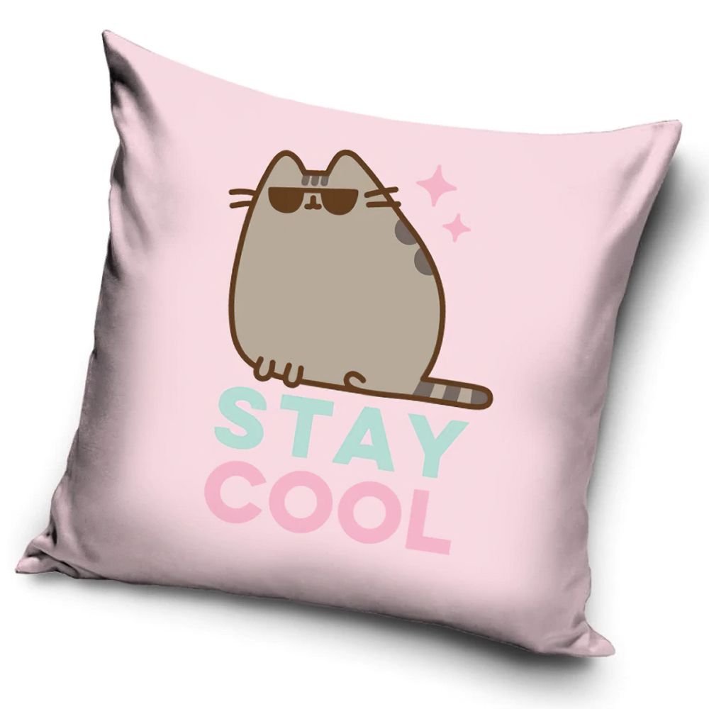 Dětský povlak na polštářek s motivem oblíbené komiksové kočičky Pusheen na růžovém podkladu s nápisem stay cool. Povlak na polštářek je oboustranný v rozměru 40x40cm, má zapínání na ZIP a je vyroben ze 100% polyesteru. Polštářek se vyznačuje svým krátkým a hladkým chloupkem, který připomíná samet. Tato struktura zajišťuje jasnější barvy na polštářku, které na své kráse neztratí ani po vyprání. Výplň je tvořena ze 100% polyesteru (kuličky z dutého vlákna). Povlak je možné objednat samostatně bez výplně, s levnější dekorační výplní nebo luxusnější výplní na spaní.