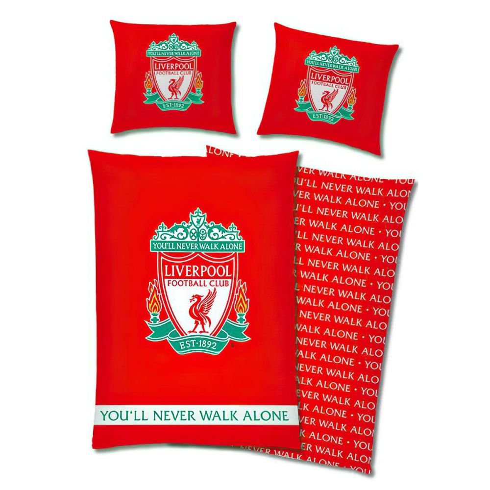 Bavlněné fotbalové povlečení s logem FC Liverpool v červené barvě. Rubovou stranu tvoří nápisy na červeném podkladu. Povlak na polštář má z obou stran stejné vzory jako přikrývka. Souprava je vyrobena ze 100% bavlny a obsahuje jeden povlak na přikrývku 140 x 200 cm a jeden povlak na polštář 70 x 90 cm. Zapínání na zip.