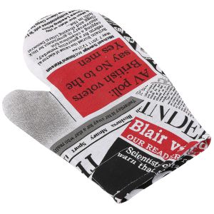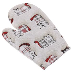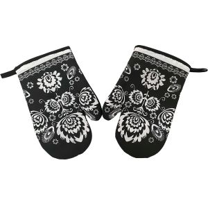 Kuchyňská chňapka (rukavice) se vzorem bílých květů listů na šedém podkladu. Chňapka má všité poutko na zavěšení. Chňapka je v rozměru 28x18cm a je vyrobena ze 100% bavlny s výplní ze 100% polyesteru (rouno z dutého vlákna).