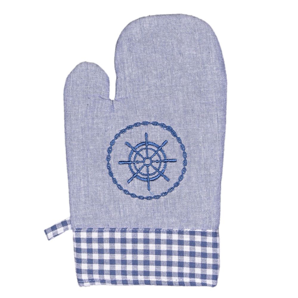 Kuchyňská chňapka (rukavice) s kuchyňským jednostranným vzorem modrého kára a kola s kormidlem uprostřed. Chňapka má všitý magnet a poutko na zavěšení. Chňapka je v rozměru 28x18cm a je vyrobena ze 100% bavlny s výplní ze 100% polyesteru (rouno z dutého vlákna).