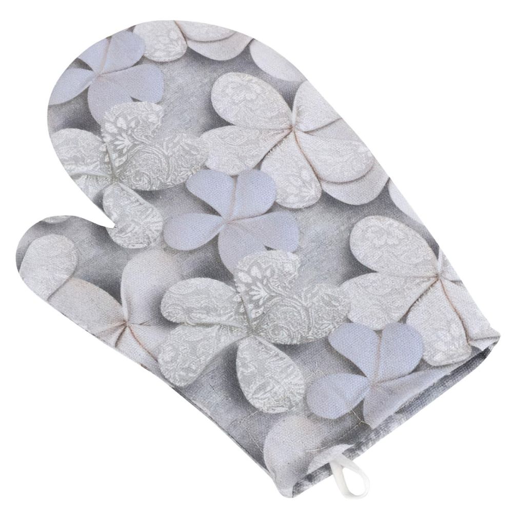 Kuchyňská chňapka (rukavice) s motivem šedých květů. Chňapka je v rozměru 28x18cm a je vyrobena z kombinace 90% bavlny a 10% polyesteru. Výplň je z netkané textilie. Chňapka má magnet i poutko na zavěšení a díky své tloušťce dostatečně ochrání před horkými hrnci a předměty.