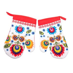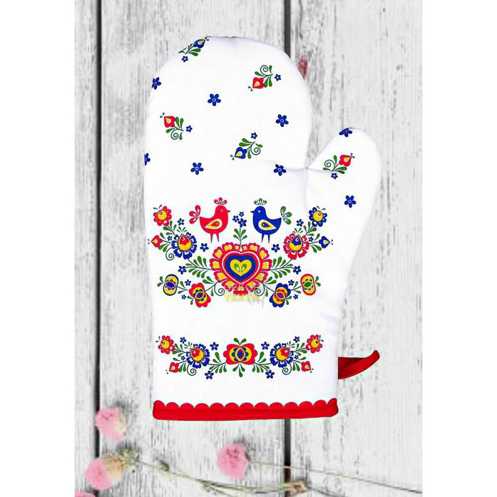Kuchyňská chňapka (rukavice) s tradičním venkovským oboustranným vzorem květů a ptáčků v červeném provedení na bílém podkladu. Chňapka má všitý magnet a poutko na zavěšení. Chňapka je v rozměru 28x18cm a je vyrobena ze 100% bavlny s výplní ze 100% polyesteru (rouno z dutého vlákna).