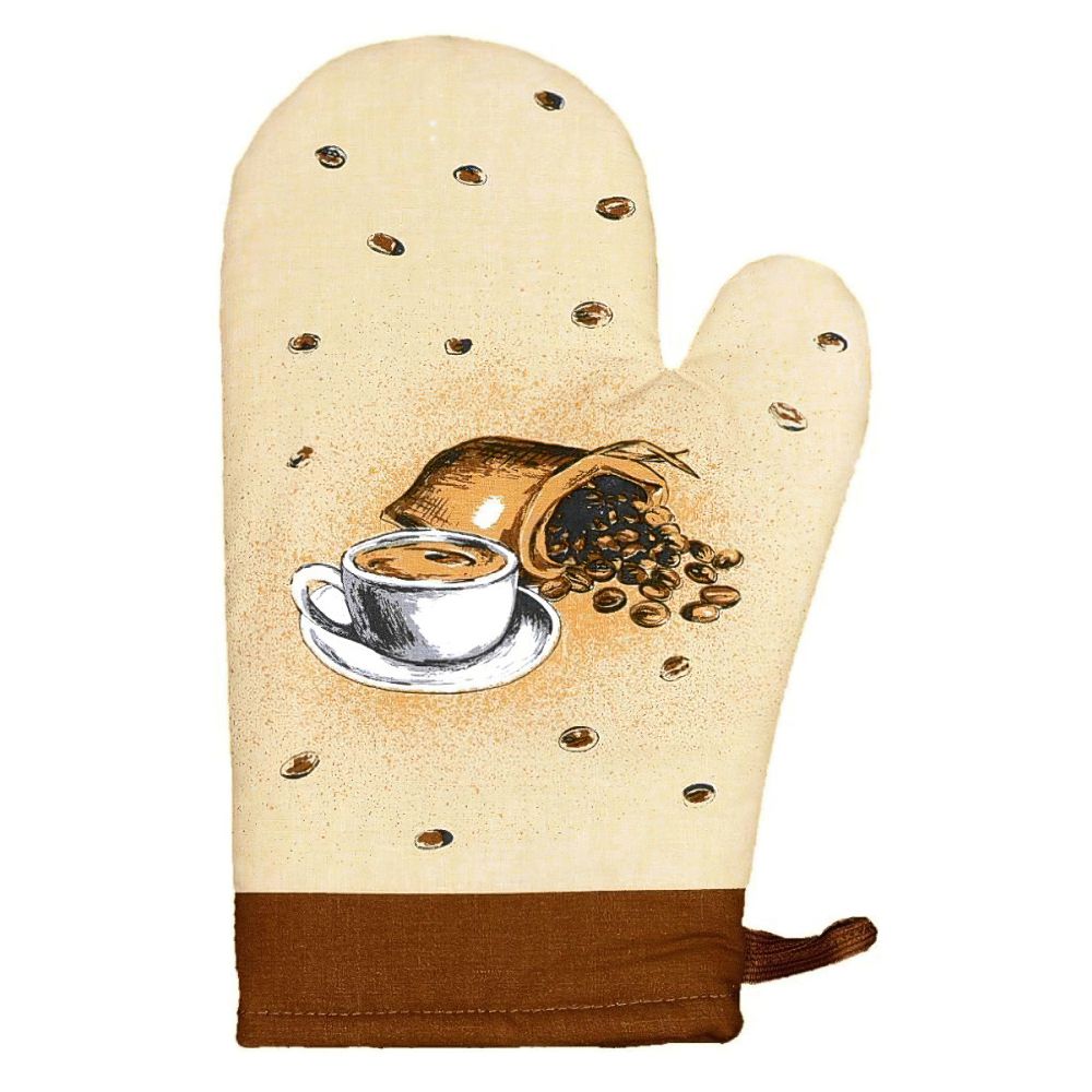 Kuchyňská chňapka (rukavice) s kuchyňským oboustranným vzorem kávy v béžovém provedení s hnědým spodním lemem. Chňapka má všitý magnet a poutko na zavěšení. Chňapka je v rozměru 28x18cm a je vyrobena ze 100% bavlny s výplní ze 100% polyesteru (rouno z dutého vlákna).