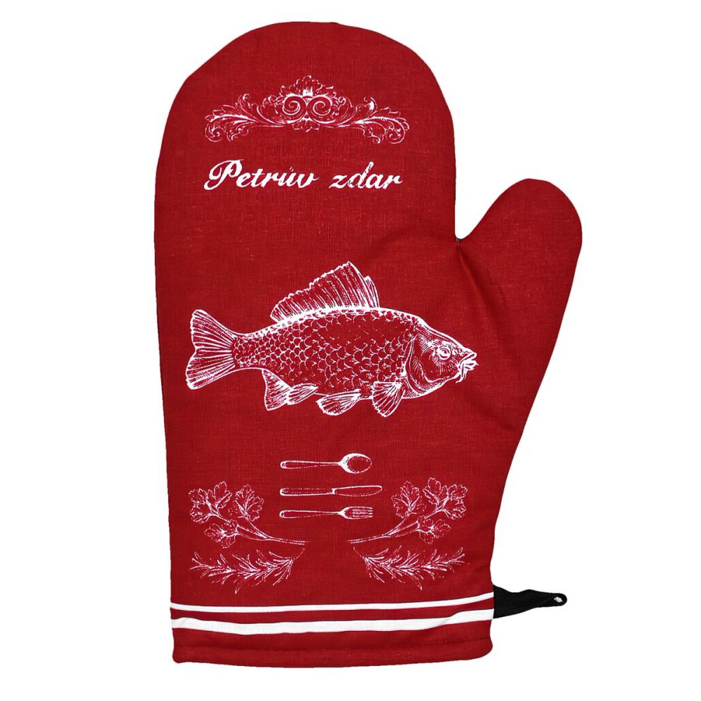 Kuchyňská chňapka (rukavice) se vzorem ryby a nápisu Petrův zdar v červeném provedení. Chňapka má všitý magnet a poutko na zavěšení. Chňapka je v rozměru 28x18cm a je vyrobena ze 100% bavlny s výplní ze 100% polyesteru (rouno z dutého vlákna).