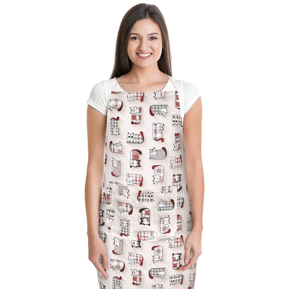 Kuchyňská zástěra vyrobená v kombinaci 70 % bavlna, 30 % polyester se vzorem červených koček na béžovém podkladu. Zástěra má rozměr 67x84cm, a je tak vhodná na každou postavu. Opatřena je praktickou velkou kapsou uprostřed.