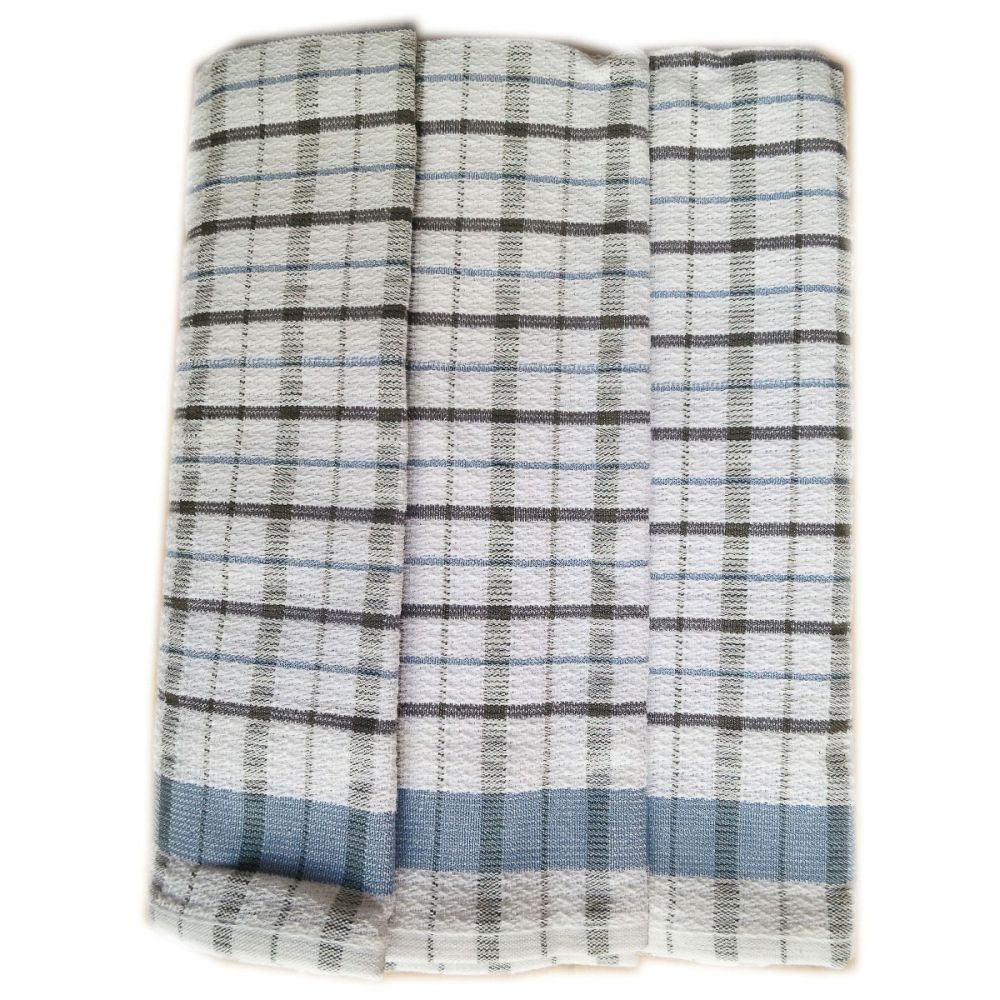 Souprava tří kusů kuchyňských utěrek z exkluzivní egyptské bavlny v rozměru 50x70cm v bílé barvě s motivem kára s modrými a černými proužky.