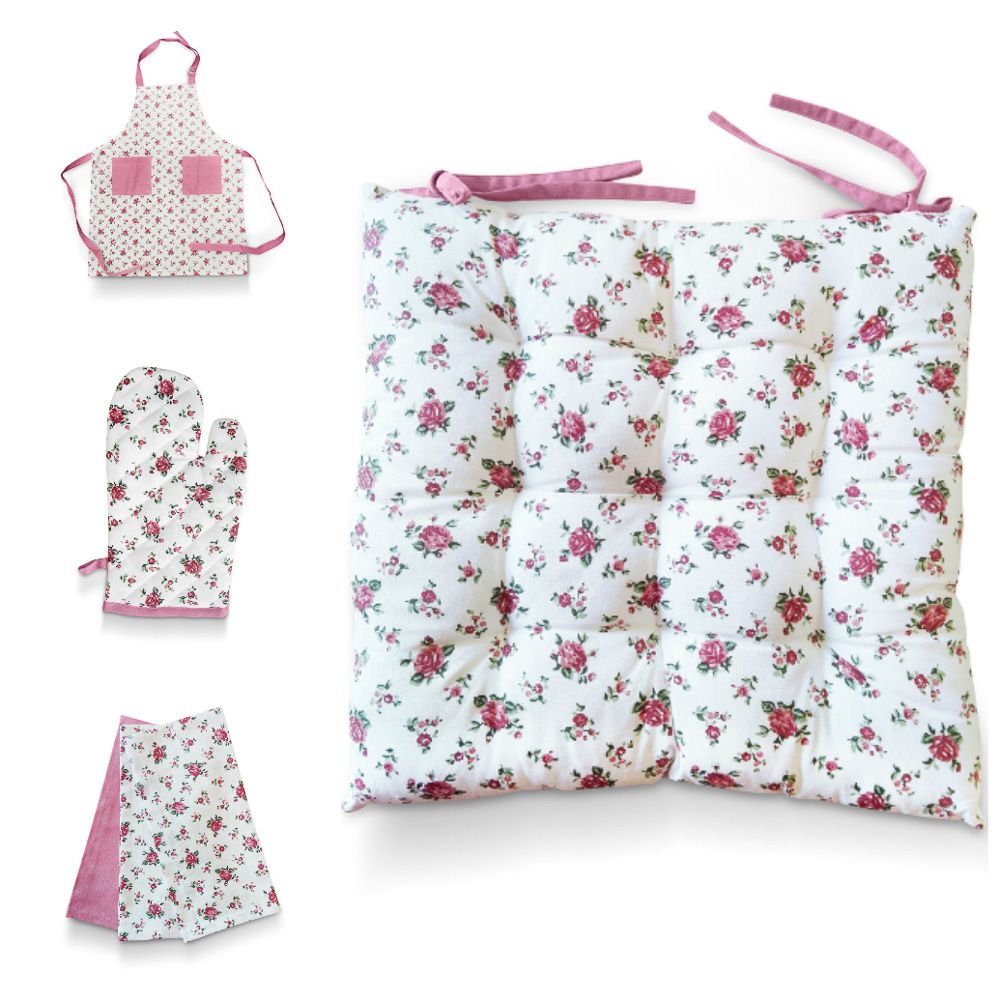 Kuchyňská sada s motivy růžových květinek na bílém pozadí. Kuchyňský set může obsahovat zástěru, utěrky, různé rozměry ubrusů, prostírání, sedáky, polštářky a další. Co bude Vaše kuchyňská sada obsahovat je jen na Vás! Stačí si vybrat v nabídce.