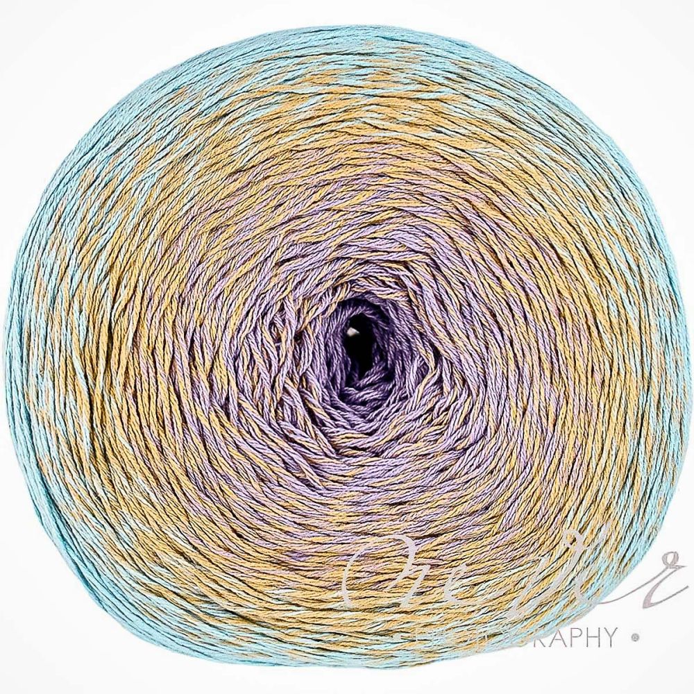 Směsová pletací i háčkovací příze (55 % bavlna, 45 % akryl) v melírované (duhové) modro-fialovo-hořčicové barvě s různobarevnými přechody. Příze je složená a stočení ze čtyř nitek. Využijete ji především na letní topy, halenky, šaty, sukně a především šátky pro dospělé i malé parádnice. Doporučená Velikost jehlic: 2 - 4 mm a velikost háčku: 2 - 4 mm. Uháčkujete z ní velmi originální modely, ať už módní šátky, nákrčník, svetry, šály, čepice, rukavice, plédy a další.