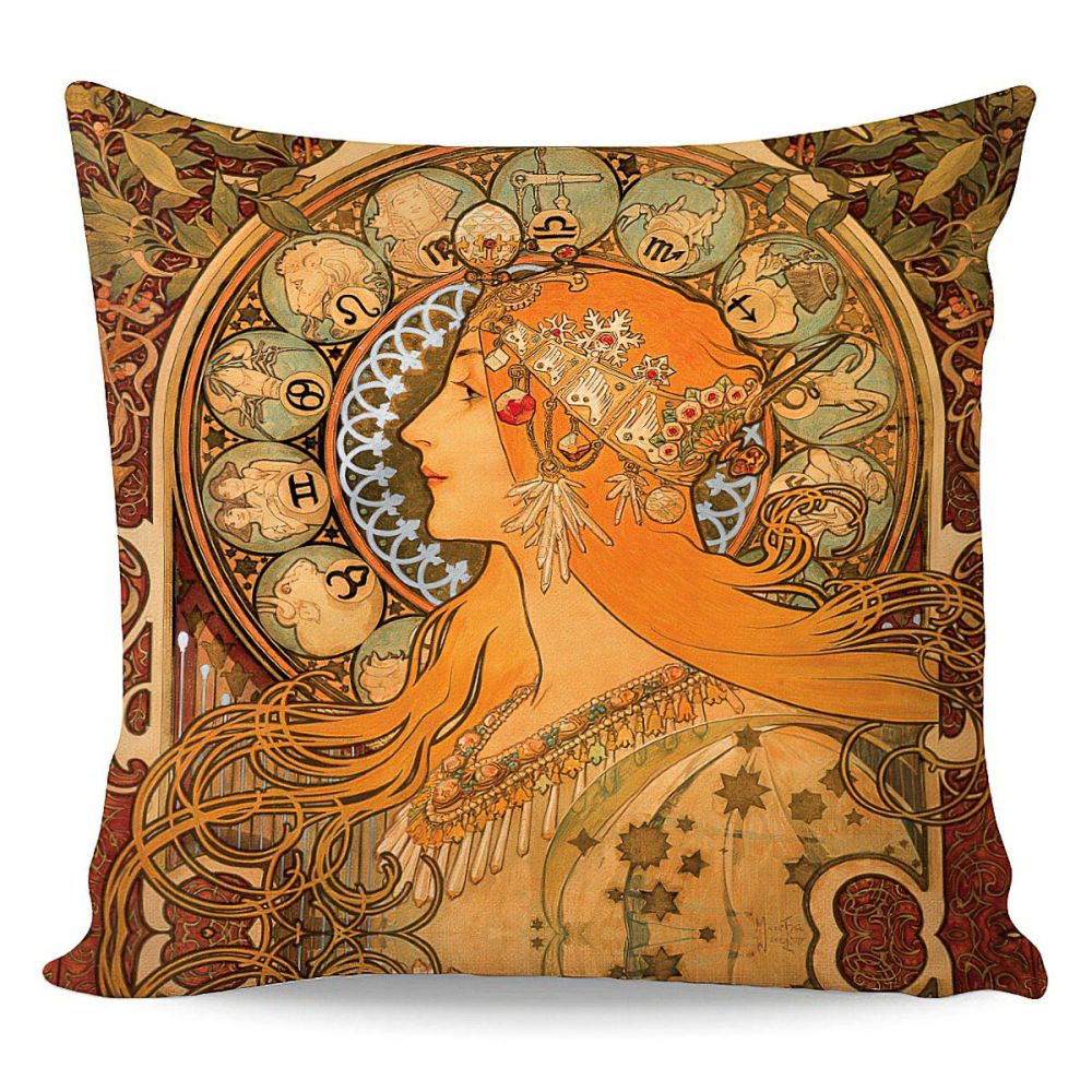 Polštářek ALFONS MUCHA ZVĚROKRUH, béžovo-hnědý, 40x40cm