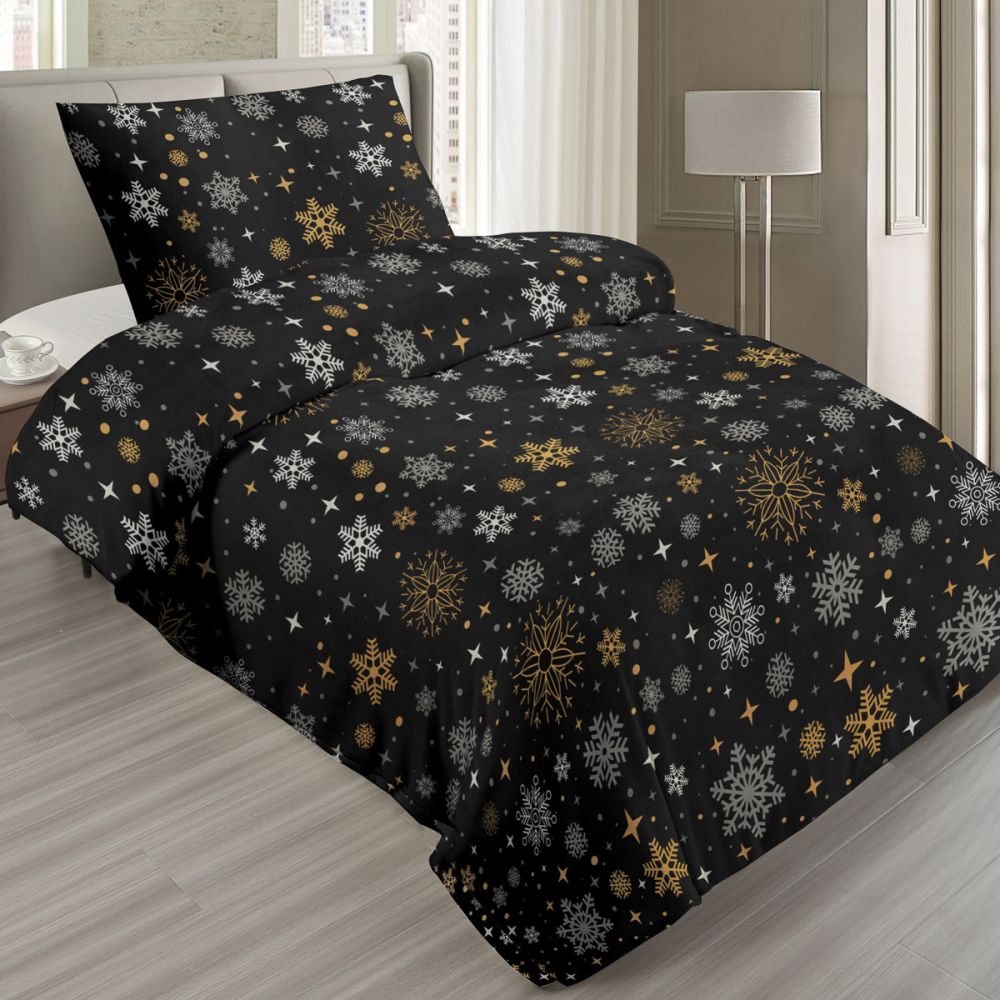 Povlečení MAGIC BLACK, vánoční motiv, zlaté a šedé vločky na černé, mikroflanel, 140x200cm + 70x90cm