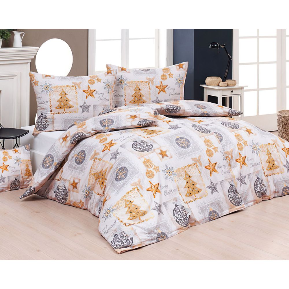 Bavlněné povlečení s krásným vánočním vzorem ve zlato-béžových barvách. Povlak na přikrývku i povlak je z obou stran stejný. Souprava je vyrobena ze 100% bavlny a obsahuje povlak na přikrývku 140 x 200 cm a povlak na polštář 70 x 90 cm. Zapínání na ZIP. Vzor je tištěn nejmodernějším digitálním tiskem, který zajišťuje vysoce precizní detail.