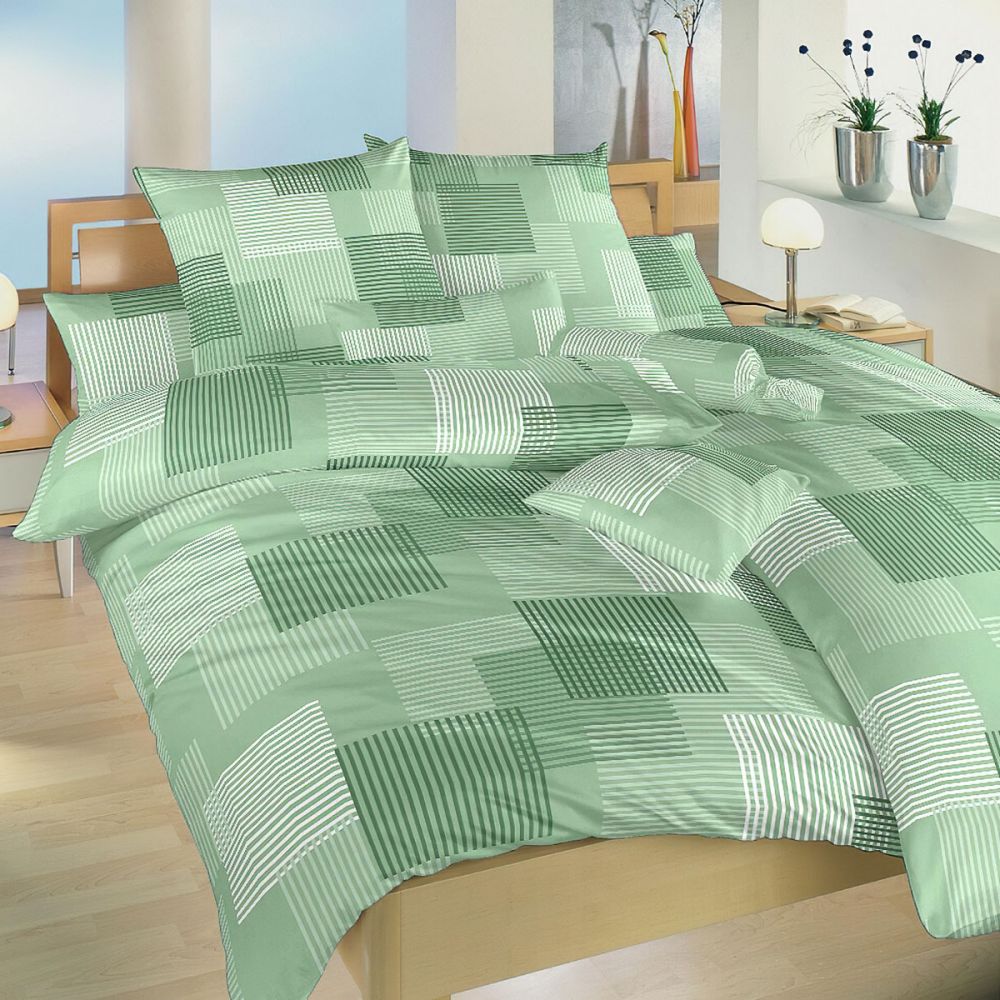 Krepové povlečení se vzorem proužku ve čtvercích v mentolově zelených odstínech. Vrchní i spodní strana přikrývky je stejná. Souprava je vyrobena ze 100% česané bavlny a obsahuje jeden povlak na přikrývku 140 x 200 cm a jeden povlak na polštář 70 x 90 cm. Zapínání na zip.