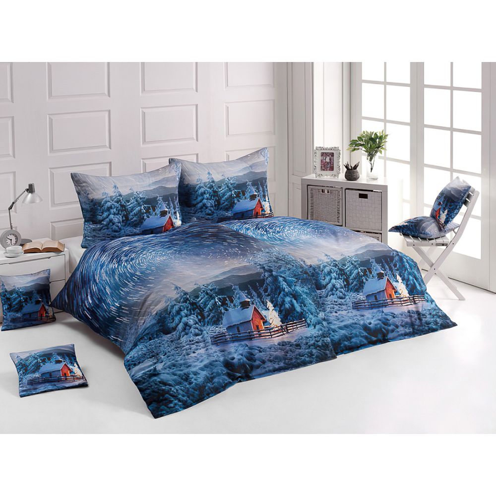 Povlečení Matějovský POLAR BLUE, zasněžená krajina s chaloupkou, modré, bavlněný satén digitál, 140x200cm + 70x90cm