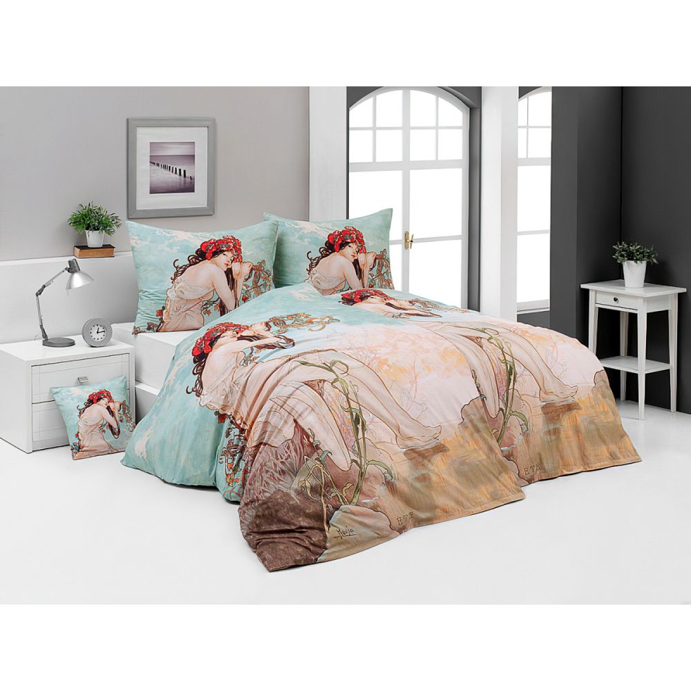 Povlečení Matějovský ALFONS MUCHA SUMMER, béžovo-svetle modré, bavlna hladká digitál, 140x200cm + 70x90cm