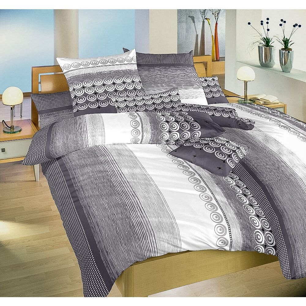 Krepové povlečení se vzorem proužků a kroužků v šedé barvě. Vrchní i spodní strana přikrývky je stejná. Souprava je vyrobena ze 100% bavlny a obsahuje jeden povlak na přikrývku 140 x 200 cm a jeden povlak na polštář 70 x 90 cm. Zapínání na zip.